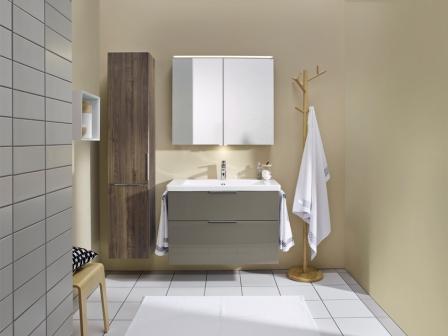 Badmöbeleinheit bestehend aus Waschtisch mit Unterschrank (2 Auszüge), Spiegelschrank doppelt verspiegelt und Lampe, Breite: 86 cm, Eiche dunkel